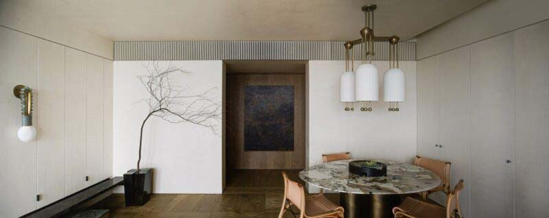 Dự án ”Imperfect Residence” của NC Design & Architecture ở Hồng Kông minh họa cho cách tiếp cận wabi-sabi đối với sự không hoàn hảo trong thiết kế nội thất. Đối mặt với yêu cầu của khách hàng để thiết kế một không gian căn hộ già đi, người sáng lập Nelson Chow và nhóm của ông đã sử dụng các yếu tố đồng bị oxy hóa và tường thạch cao kết cấu để tạo ra một cái nhìn thô ráp, cũng như các tấm sàn gỗ được đặt theo phong cách riêng và đồ nội thất không phù hợp pha trộn vải, gỗ và kim loại, mang lại cho tài sản và cảm giác sống ngay lập tức.