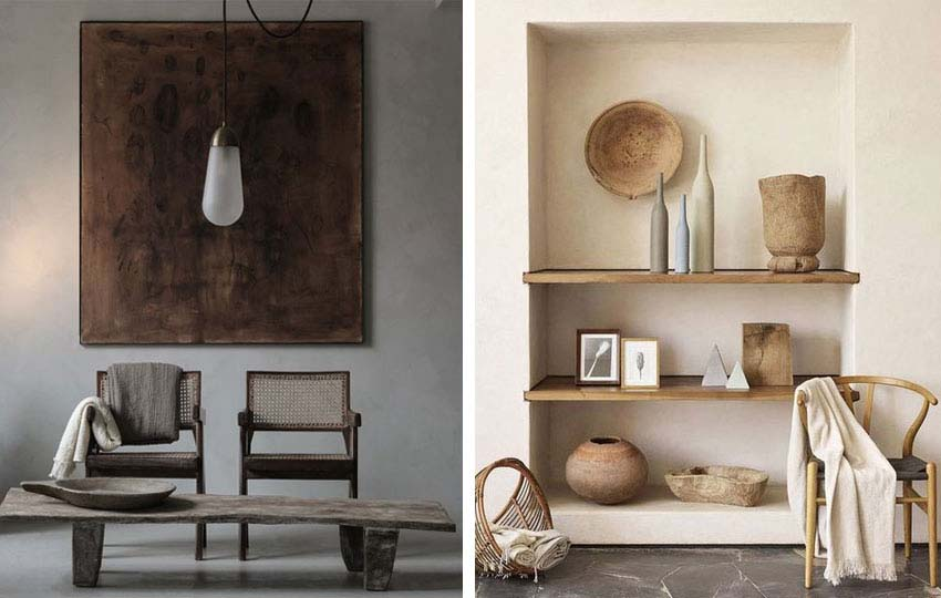Wabi-sabi tập trung vào công năng nên được bày biện tối giản, thường giữ nguyên bề mặt tự nhiên ban đầu với những sắc độ không đều, đầy ngẫu hứng cùng bề mặt xù xì, thô ráp. Bát và khay trang trí luôn là một lựa chọn vững chắc, cũng như cây trồng trong nhà có thể thêm một chút tươi mát cho không gian.